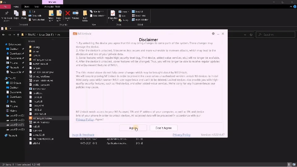 इसका मतलब ये है की बिना परमिशन के आपके डिवाइस की फाइल्स को एक्सेस किया जा सकता है और उन्हें एडिट भी किया जा सकता है। आपके डिवाइस की स्क्रीन को भी remotely रिकॉर्ड किया जा सकता है लेकिन हमें इसका बूटलोडर अनलॉक करना है। इसलिए ये सेटिंग ऑन करना जरुरी है, क्योंकि हमें इसकी फाइल्स को edit ही करना है जोकि हम Mi Unlock Tool के द्वारा करेंगे, इसलिए हमें सिम्पली इसे Accept कर लेना है।