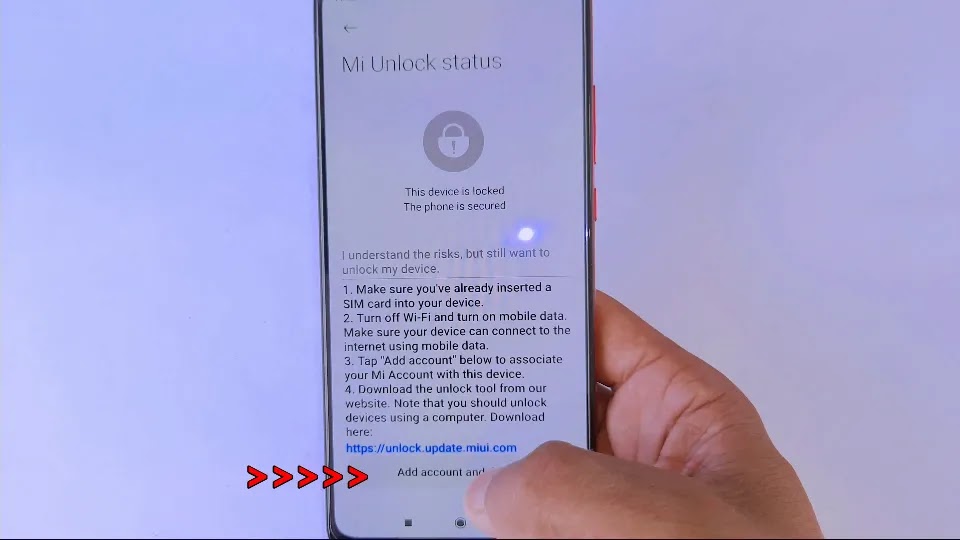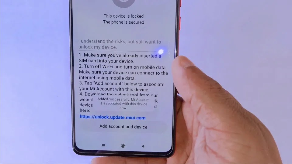 अब हमें Mi Unlock Status को ओपन करना है और उसके बाद वहाँ जो Add account and Device लिखा है उसपर क्लिक कर देना करके अपने अकाउंट को add कर देना है।