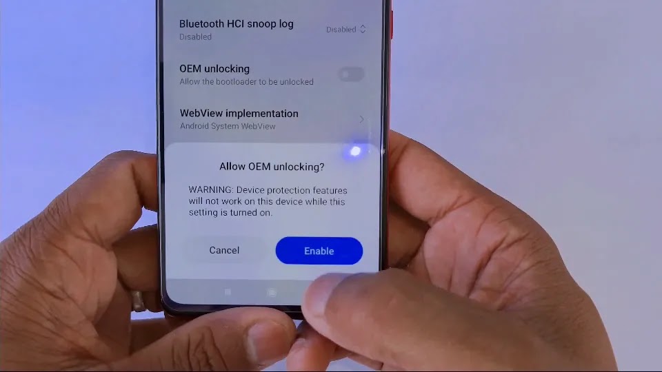 अब यहाँ ये कुछ warning आती है इसका Basically मतलब ये है की Bootloader Unlock के बाद हमारे डिवाइस के लिए जो प्रोटेक्शन फीचर्स कंपनी की और से हमें मिलते हैं वो अब काम नहीं करेंगे। लेकिन हमें इसमें बिल्कुल भी लोड लेने की जरुरत नहीं है। हमें सिम्पली इसे Enable कर देना है क्योंकि Bootloader अनलॉक करने के लिए इसे इनेबल करना जरुरी है।
