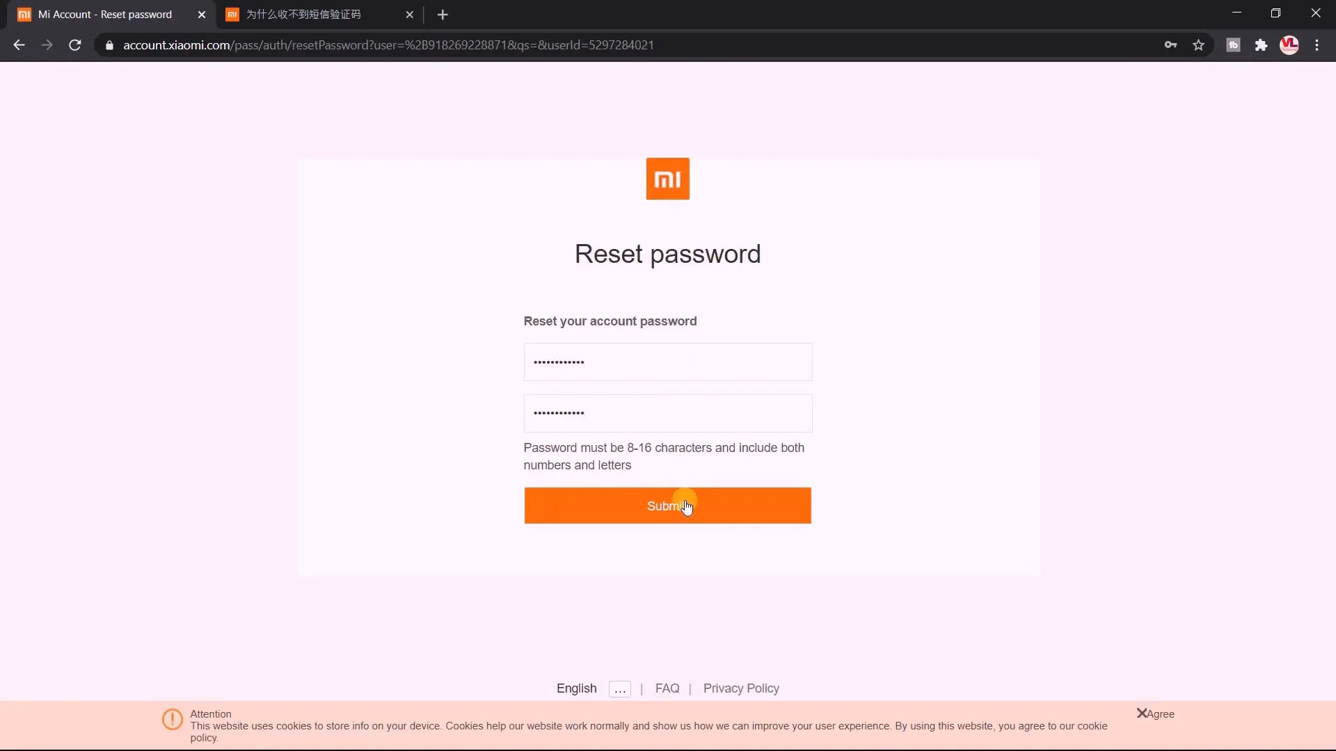 अब दोस्तों कुछ इस प्रकार से हम Mi Account Reset Password के पेज पर डायरेक्ट हो जायेंगे। यहाँ दोस्तों हमें दोनों Fields में नए पासवर्ड एंटर करने हैं। Enter करने के बाद Submit पर क्लिक कर देना है।