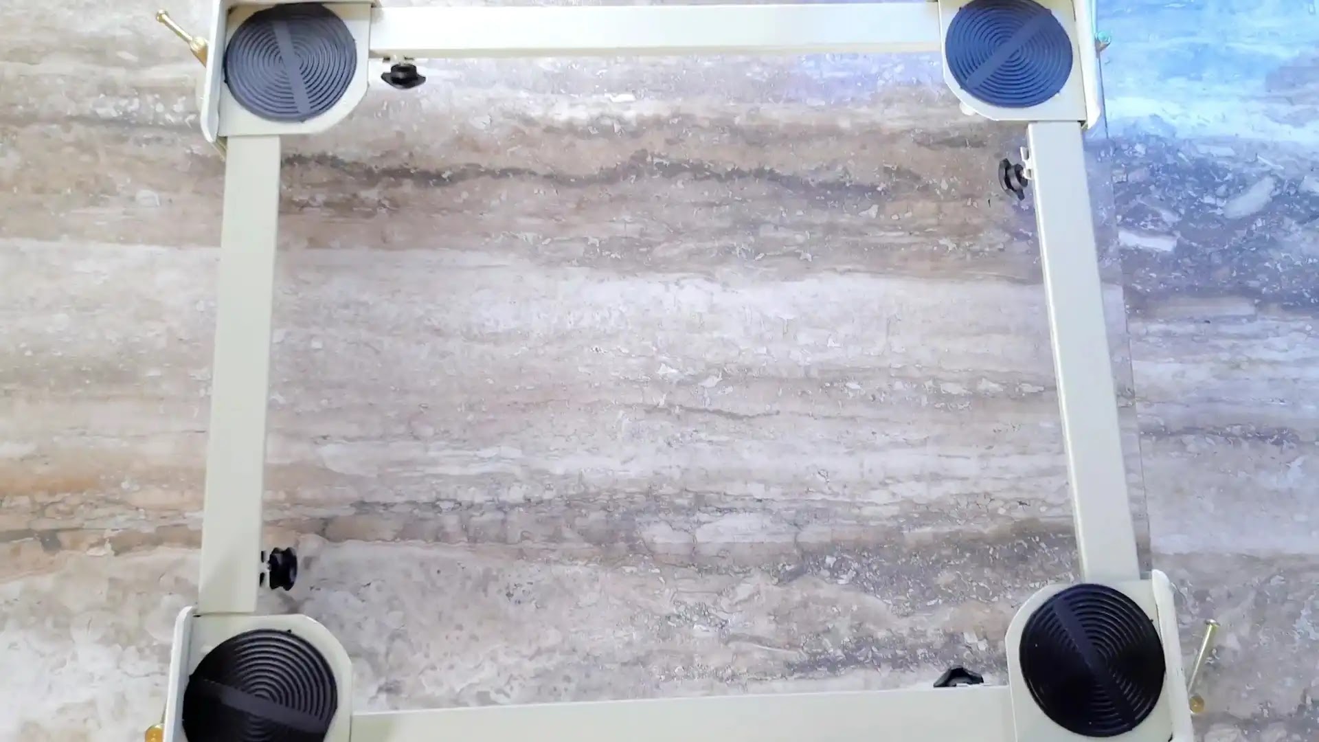 ट्राली के निचे हमें ये 4 Vibration absorber मिल जाते हैं जिनकी सहायता से हम इस ट्राली को एक जगह पर फिक्स तो कर सकते हैं लेकिन एक चीज में और ये काम आते हैं जैसी की हमने ट्राली पर वाशिंग मशीन रख रखी है ठीक है तो जब हम उसे यूज़ करते हैं तो वो Vibrate करती है। हां मुझे पता है बेहतर क्वालिटी की और प्रीमियम हल्का सी Vibrate होती हैं लेकिन अगर आपके होती है और कपडे धोते धोते वो घर में चक्कर लगा लेती है तो इनकी हेल्प से नहीं लगाएगी।एक बात और इन्हें ऊपर – नीचे भी हम बहुत ही आसानी से कर बोल्ट की सहायता से सकते हैं।